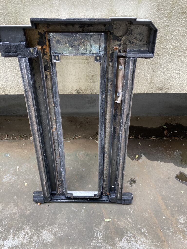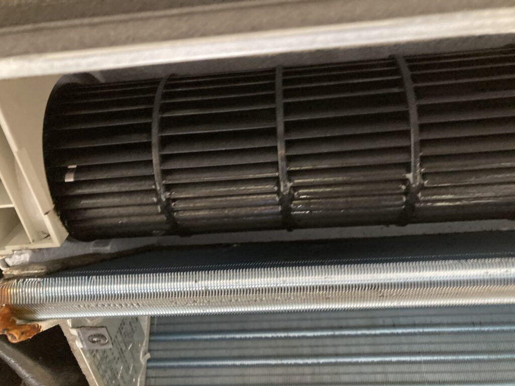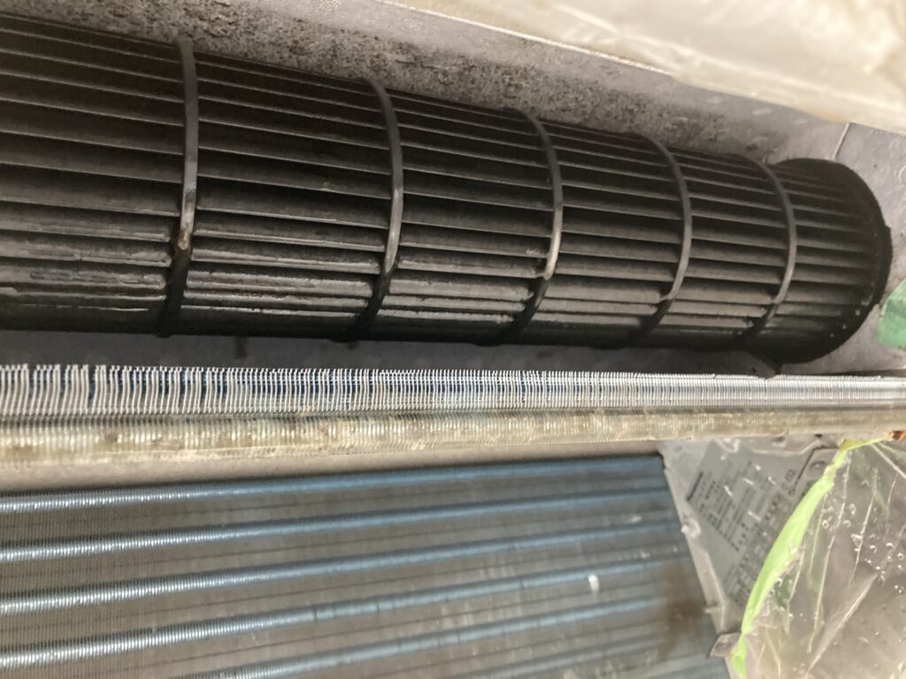 天井埋込型のエアコンの場合、ドレインパンに水が溜まり、そこに雑菌が繁殖して汚れていきます。もちろん、アルミフィンやシロッコファンも同様にカビやほこりなどの汚れがたまっていきます。